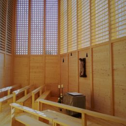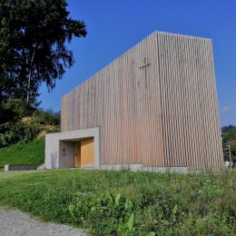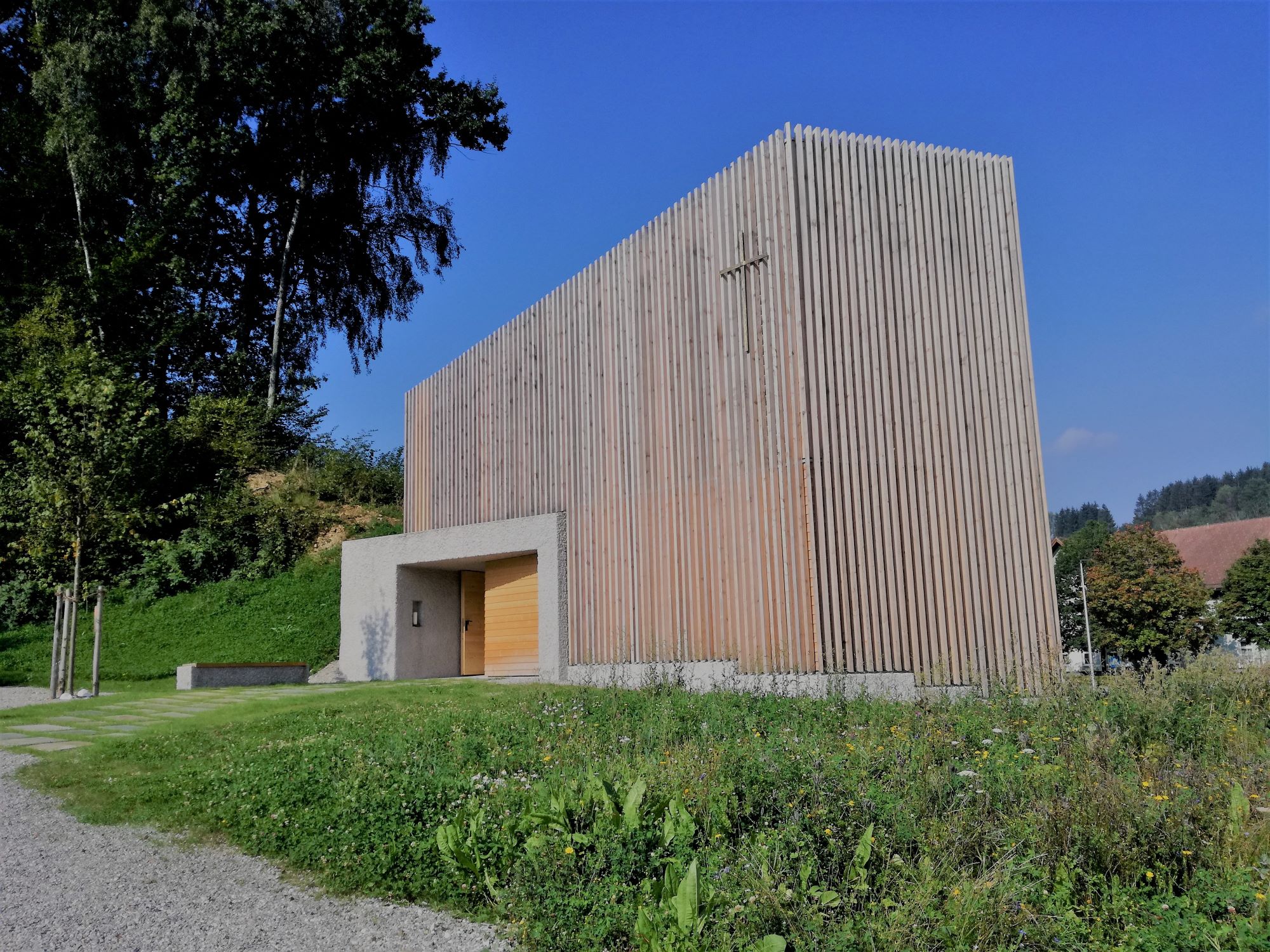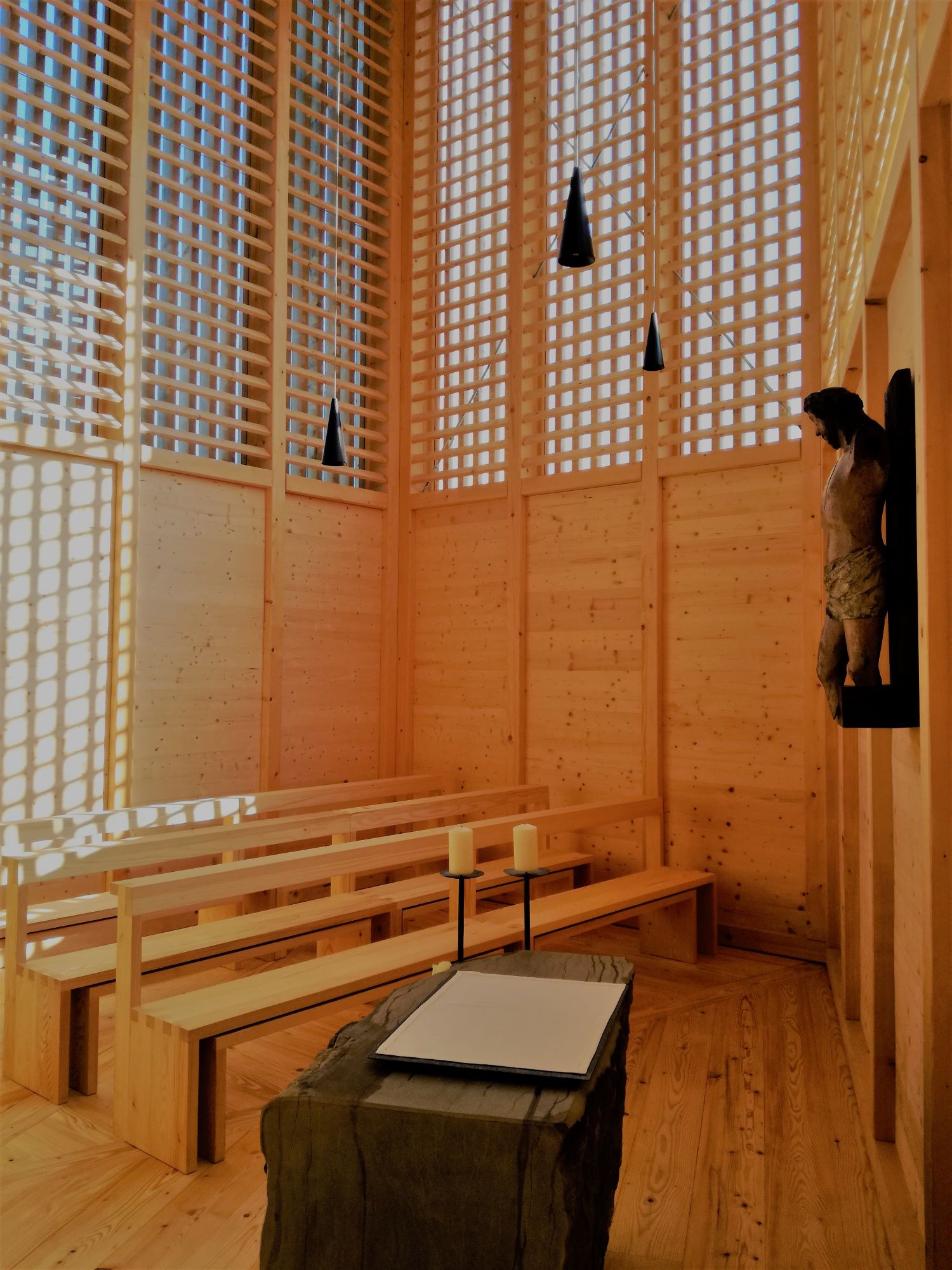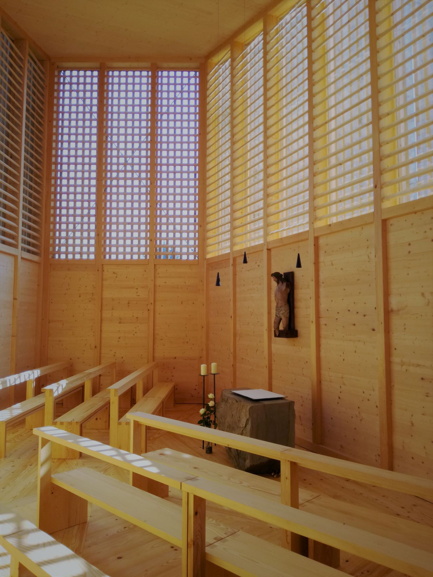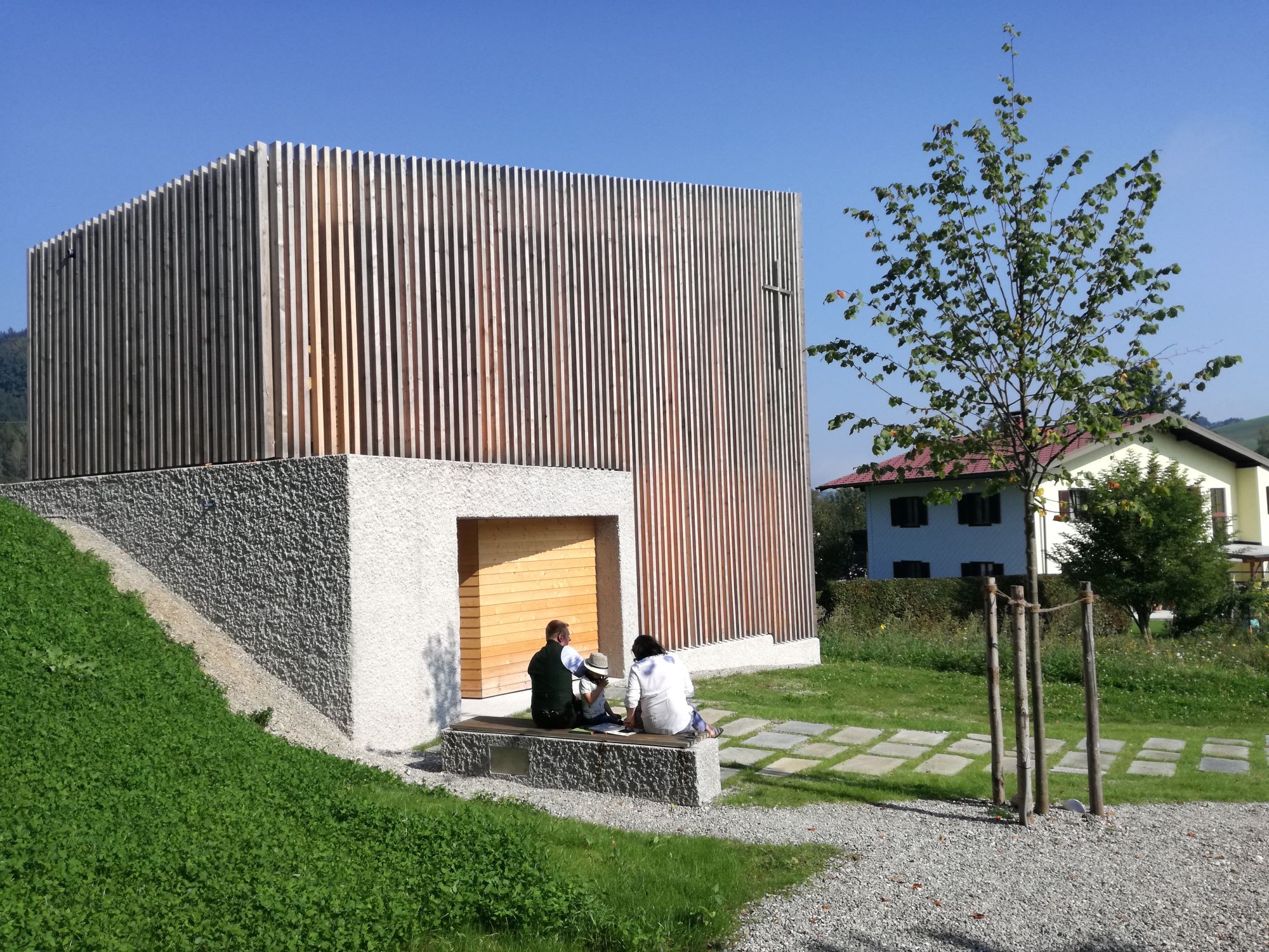 2020.Nach dem Entwurf der LP architektur ZT GmbH entstand in Straß im Attergau eine Auferstehungskapelle in besonderer Holzbauweise. Auf Natürlichkeit wird in der zum Großteil aus Fichtenvollholz bestehenden Innenausstattung des Kapellenraumes besonders großer Wert gelegt. Gespitzter Beton dient als Fundament und statisches Tragwerk und verleiht der Kapelle in Kombination mit Holz eine besondere Atmosphäre.