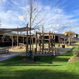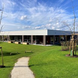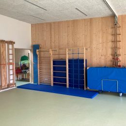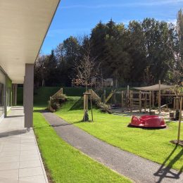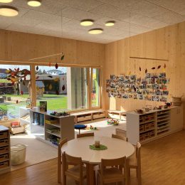 Die hellen, offenen und teilweise mit Sichtholzelementen gestalteten Gruppenräume und der großzügige angelegte Garten schaffen eine Atmosphäre zum Wohlfühlen.